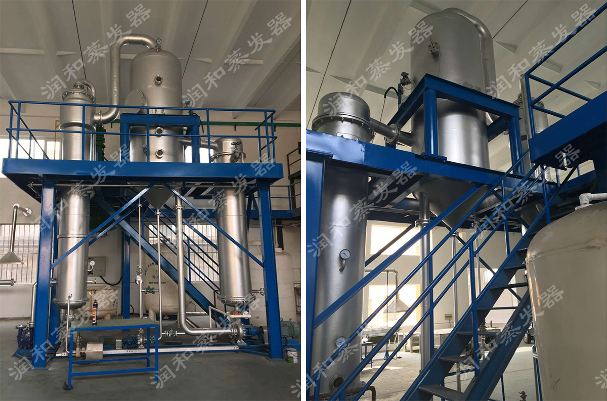 單效濃縮器由加熱室、分離器、除沫(mò)器、汽液分離器、冷凝器、冷卻器(qì)、貯液桶(tǒng)、循環管等部(bù)件組成,整套設備采用不鏽鋼材料(liào)製成(chéng)。